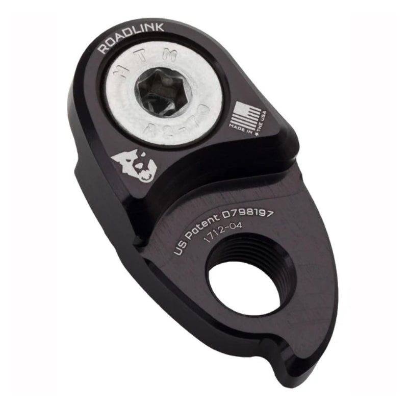 The RoadLink derailleur hanger extension is a unique patented device that offsets the position of your road derailleur to make it possible to run a wide-range mountain bike style cassette. It is an ideal solution for riders looking to convert their road, gravel, cyclocross, or commuter drivetrain bike to attain the simplicity and reduced weight of a single front chainring but without giving up the gear range of a double. It is also great for riders with double chainring bikes that want lower gearing for those ultra steep climbs. It does not compromise the shifting in the smaller cogs of the cassette but yet it enables the derailleur to work with as large as a 40T cassette.